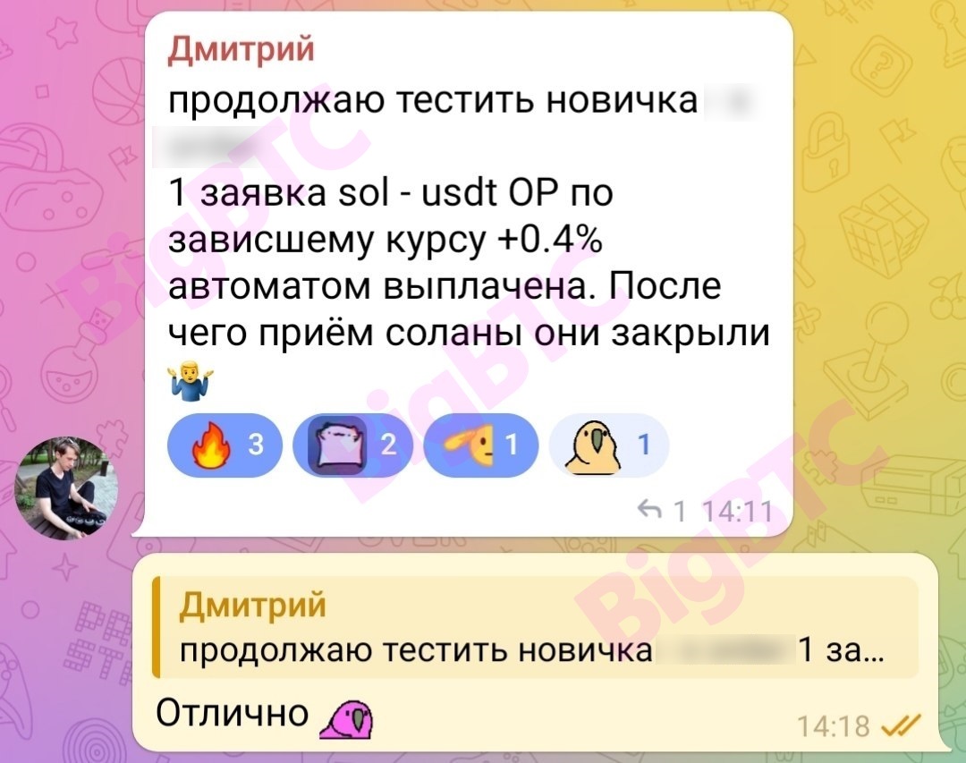продолжаю тестить новичка - (...) 1 заявка sol - usdt OP по зависшему курсу +0.4% автоматом выплачена. После чего приём соланы они закрыли🤷♂️ Отлично 🤪
