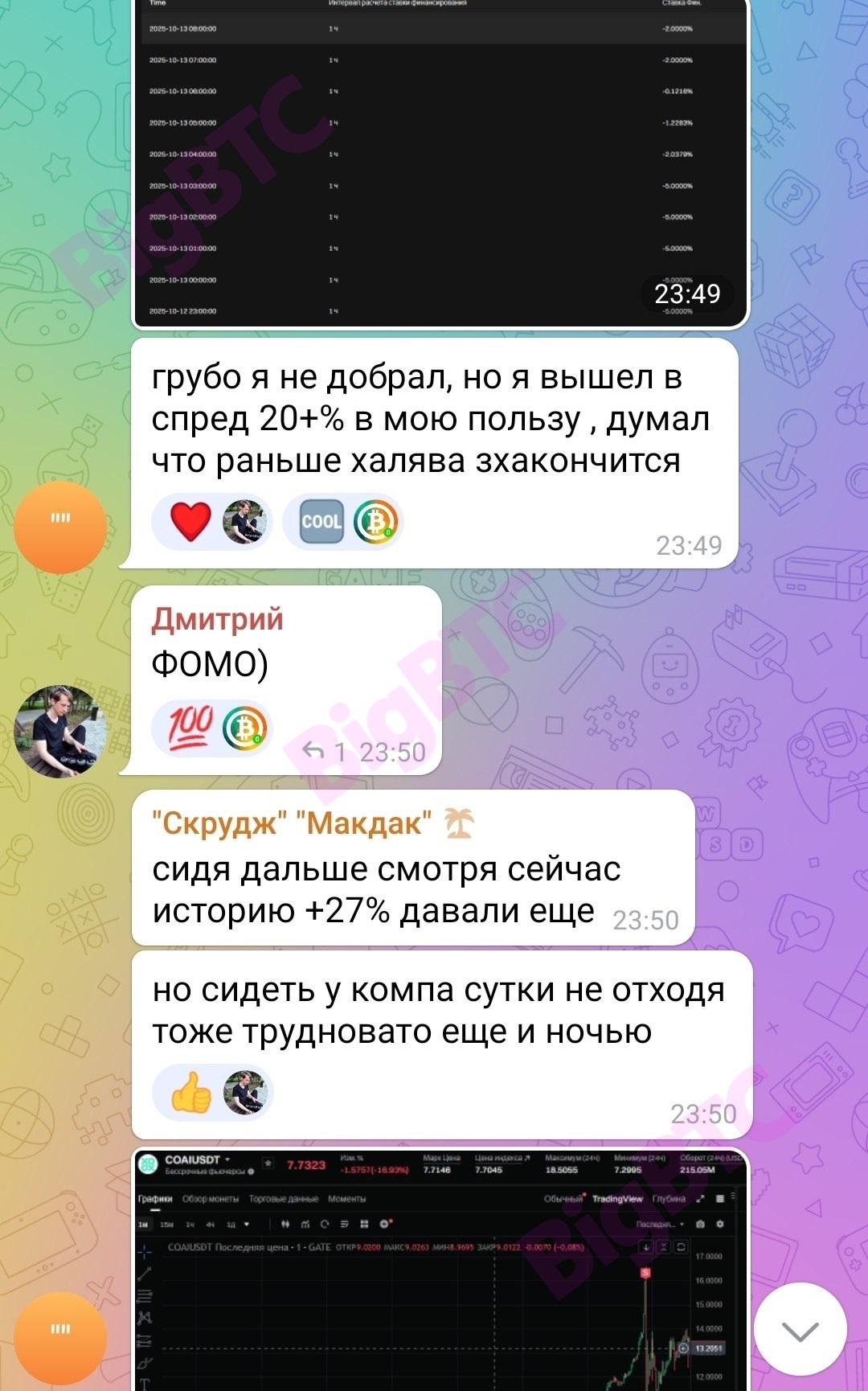 +3.4% Не посмотрел баланс на второй бирже, поэтому открылся с разным кол-вом монет. Но повезло что курс пошел в мою сторону фандинг взял и вышел? Нет, курсы сошлись Много фандинговых возможных позиций сейчас, выплаты через 20 минут