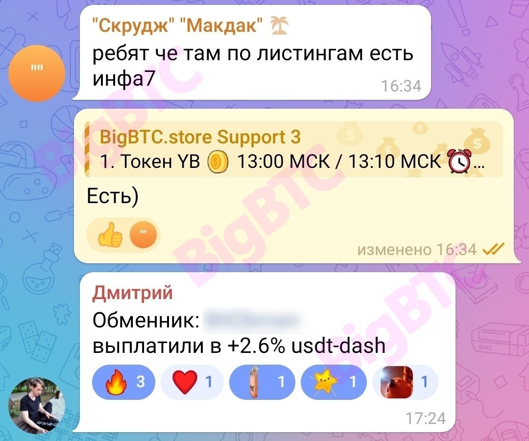 ребят че там по листингам есть инфа7 Есть) Обменник: (...) выплатили в +2.6% usdt-dash
