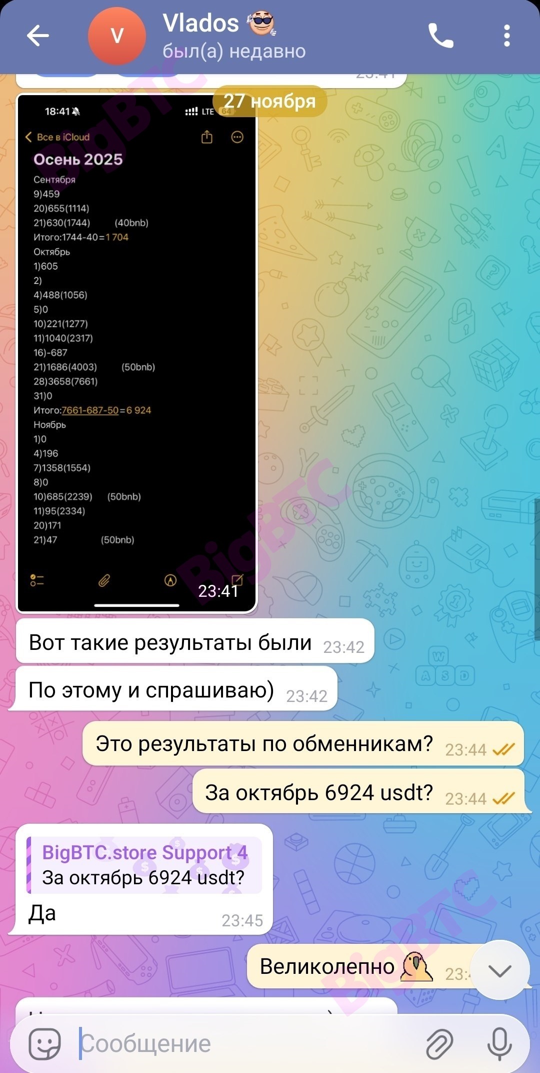 Вот такие результаты были По этому и спрашиваю) Это результаты по обменникам? За октябрь 6924 usdt? Да Великолепно