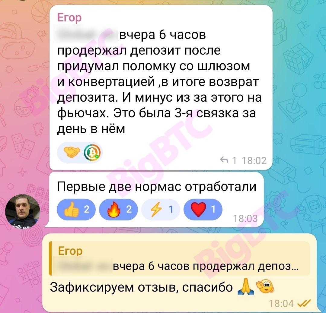 (...) вчера 6 часов продержал депозит после придумал поломку со шлюзом и конвертацией ,в итоге возврат депозита. И минус из за этого на фьючах. Это была 3-я связка за день в нём Первые две нормас отработали Зафиксируем отзыв, спасибо 🙏👌