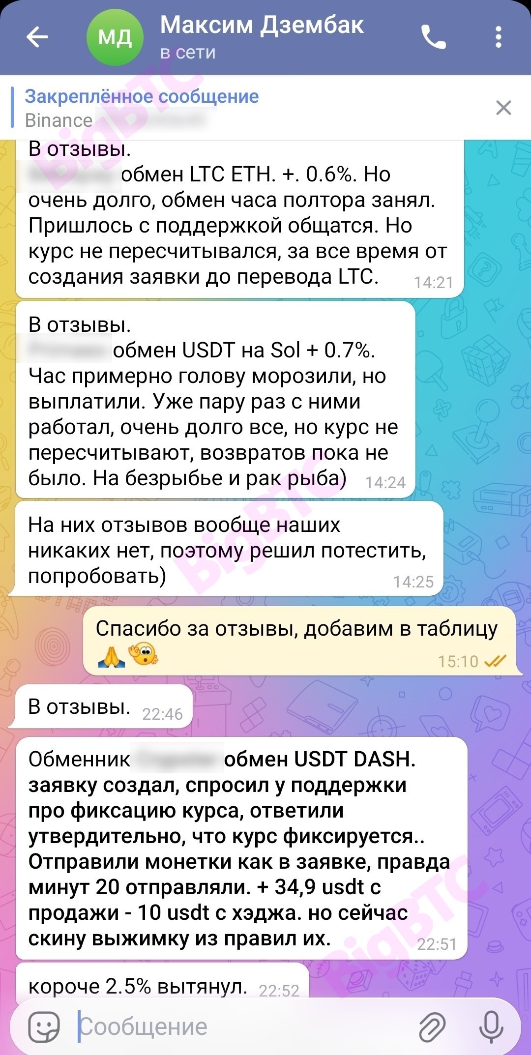 В отзывы. (...) обмен LTC ETH. +. 0.6%. Но очень долго, обмен часа полтора занял. Пришлось с поддержкой общатся. Но курс не пересчитывался, за все время от создания заявки до перевода LTC. В отзывы. (...) обмен USDT на Sol + 0.7%. Час примерно голову морозили, но выплатили. Уже пару раз с ними работал, очень долго все, но курс не пересчитывают, возвратов пока не было. На безрыбье и рак рыба) На них отзывов вообще наших никаких нет, поэтому решил потестить, попробовать) Спасибо за отзывы, добавим в таблицу 🙏👌 В отзывы. Обменник (...) обмен USDT DASH. заявку создал, спросил у поддержки про фиксацию курса, ответили утвердительно, что курс фиксируется.. Отправили монетки как в заявке, правда минут 20 отправляли. + 34,9 usdt с продажи - 10 usdt c хэджа. но сейчас скину выжимку из правил их. короче 2.5% вытянул.