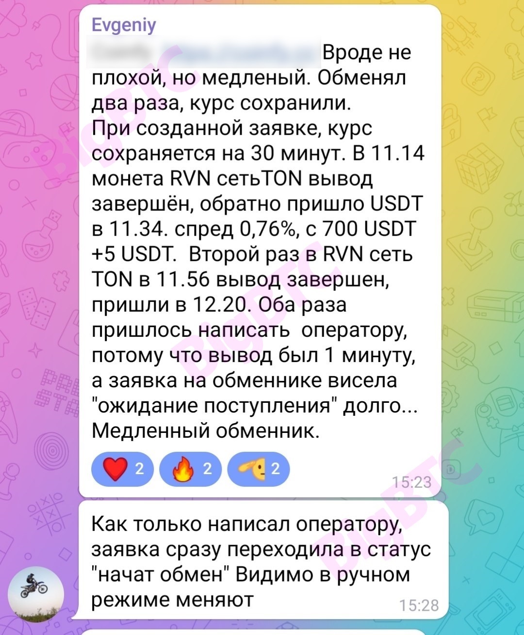 (...) Вроде не плохой, но медленый. Обменял два раза, курс сохранили. При созданной заявке, курс сохраняется на 30 минут. В 11.14 монета RVN сетьTON вывод завершён, обратно пришло USDT в 11.34. спред 0,76%, с 700 USDT +5 USDT. Второй раз в RVN сеть TON в 11.56 вывод завершен, пришли в 12.20. Оба раза пришлось написать оператору, потому что вывод был 1 минуту, а заявка на обменнике висела "ожидание поступления" долго... Медленный обменник. Как только написал оператору, заявка сразу переходила в статус "начат обмен" Видимо в ручном режиме меняют