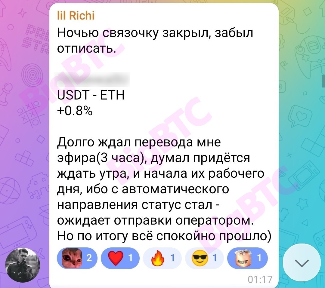 Ночью связочку закрыл, забыл отписать. (...) USDT - ETH +0.8% Долго ждал перевода мне эфира(3 часа), думал придётся ждать утра, и начала их рабочего дня, ибо с автоматического направления статус стал - ожидает отправки оператором. Но по итогу всё спокойно прошло)