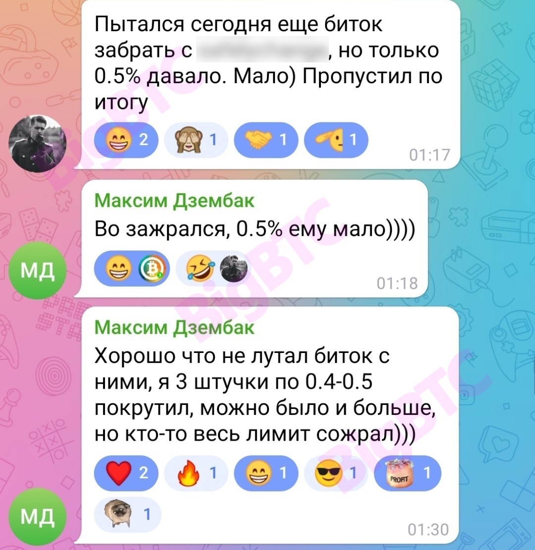 Пытался сегодня еще биток забрать с (...), но только 0.5% давало. Мало) Пропустил по итогу Во зажрался, 0.5% ему мало)))) Хорошо что не лутал биток с ними, я 3 штучки по 0.4-0.5 покрутил, можно было и больше, но кто-то весь лимит сожрал)))