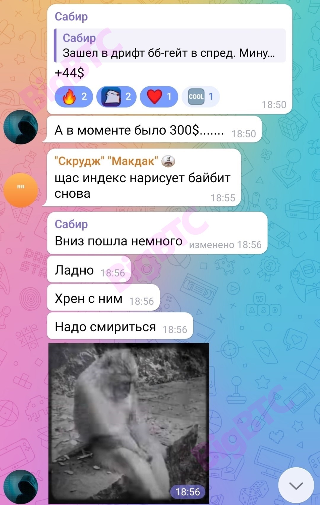 +44$ А в моменте было 300$....... щас индекс нарисует байбит снова Вниз пошла немного Ладно Хрен с ним Надо смириться