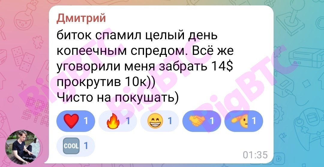 биток спамил целый день копеечным спредом. Всё же уговорили меня забрать 14$ прокрутив 10к)) Чисто на покушать)