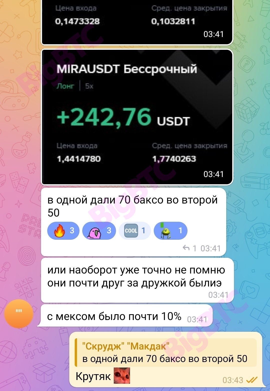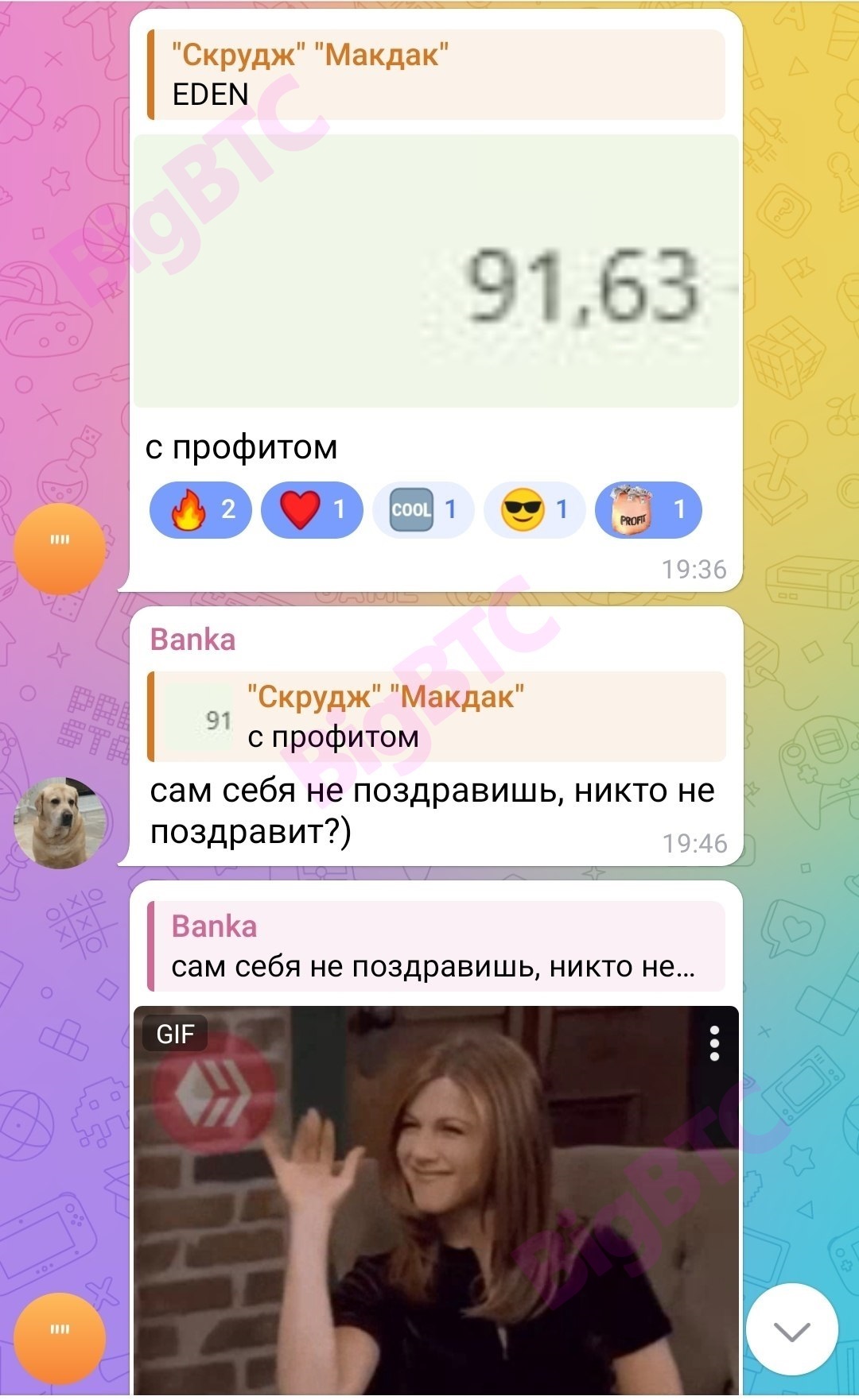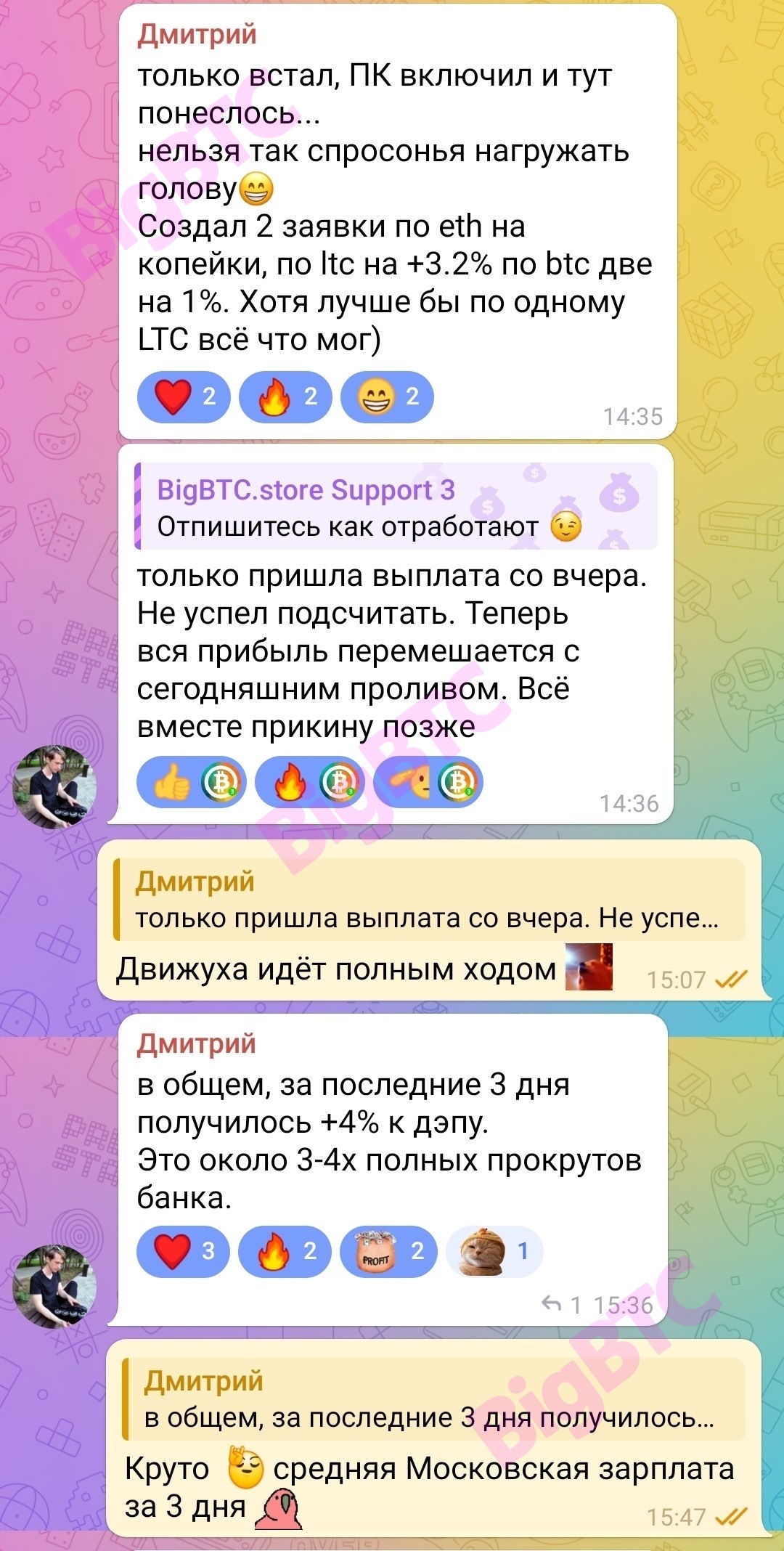 только встал, ПК включил и тут понеслось... нельзя так спросонья нагружать голову😁 Создал 2 заявки по eth на копейки, по ltc на +3.2% по btc две на 1%. Хотя лучше бы по одному LTC всё что мог) только пришла выплата со вчера. Не успел подсчитать. Теперь вся прибыль перемешается с сегодняшним проливом. Всё вместе прикину позже Движуха идёт полным ходом 🥳 в общем, за последние 3 дня получилось +4% к дэпу. Это около 3-4х полных прокрутов банка. Круто 🤟 средняя Московская зарплата за 3 дня