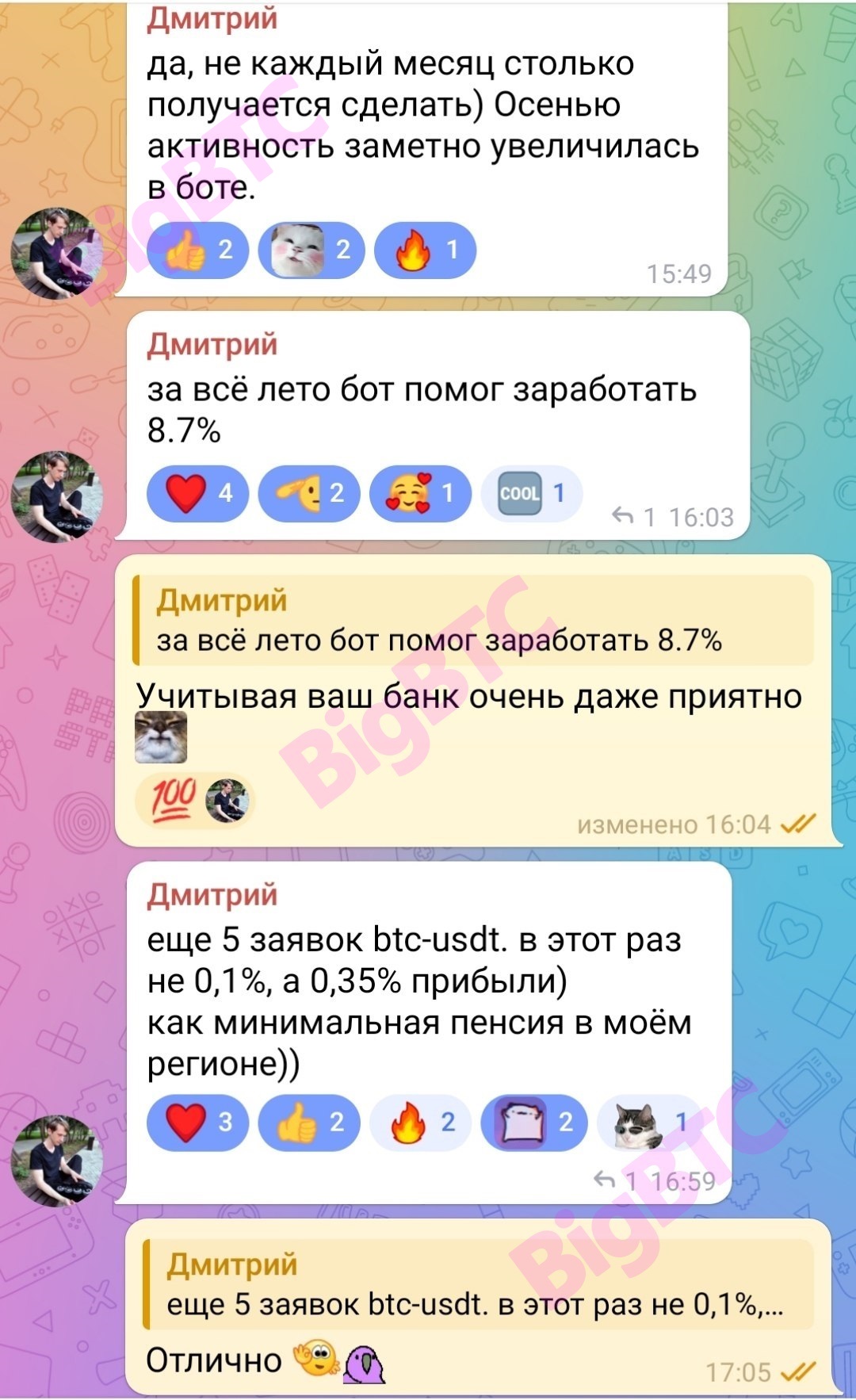 да, не каждый месяц столько получается сделать) Осенью активность заметно увеличилась в боте. за всё лето бот помог заработать 8.7% Учитывая ваш банк очень даже приятно 🙂 еще 5 заявок btc-usdt. в этот раз не 0,1%, а 0,35% прибыли) как минимальная пенсия в моём регионе)) Отлично 👌