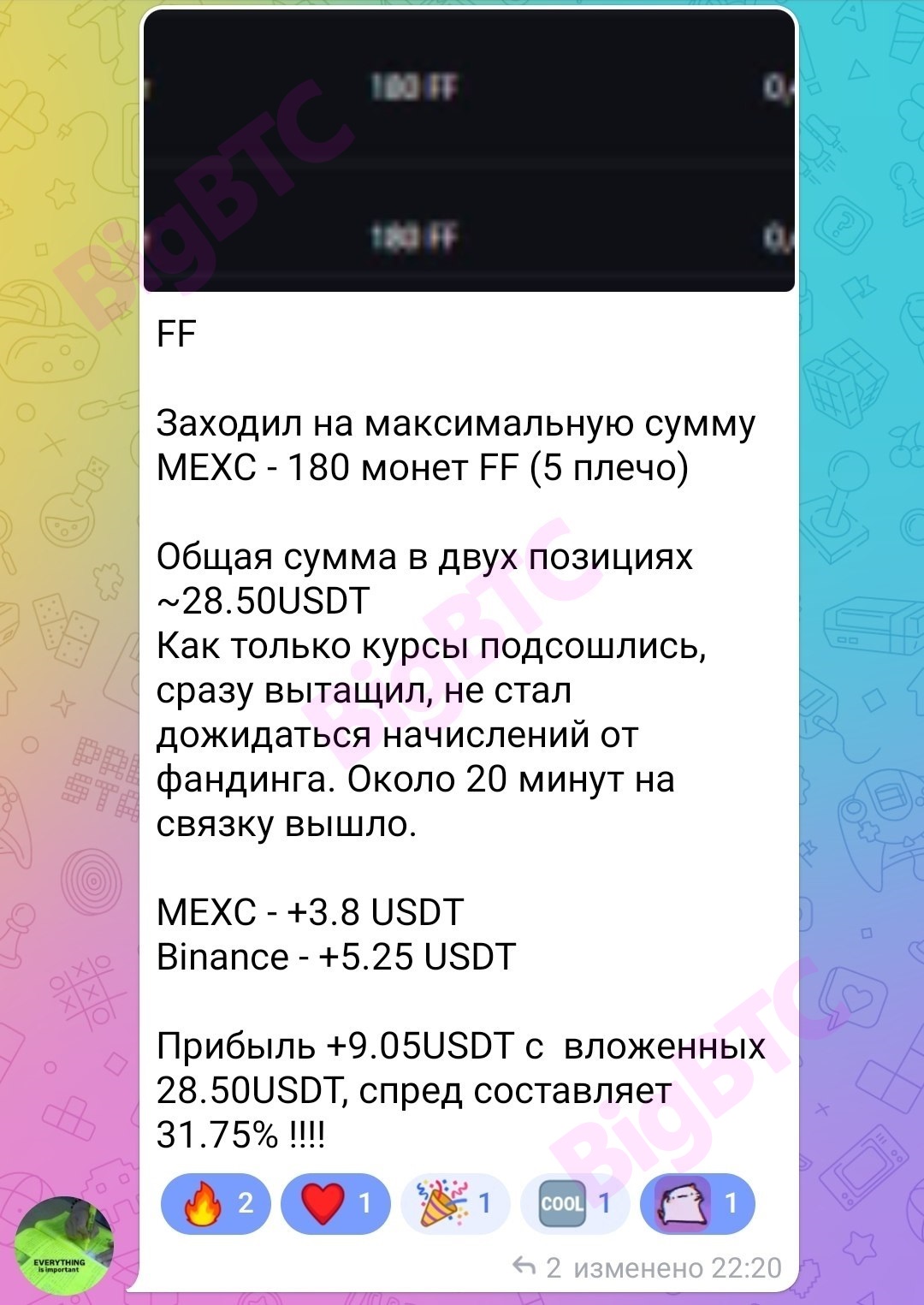 FF Заходил на максимальную сумму MEXC - 180 монет FF (5 плечо) Общая сумма в двух позициях ~28.50USDT Как только курсы подсошлись, сразу вытащил, не стал дожидаться начислений от фандинга. Около 20 минут на связку вышло. MEXC - +3.8 USDT Binance - +5.25 USDT Прибыль +9.05USDT с вложенных 28.50USDT, спред составляет 31.75% !!!!